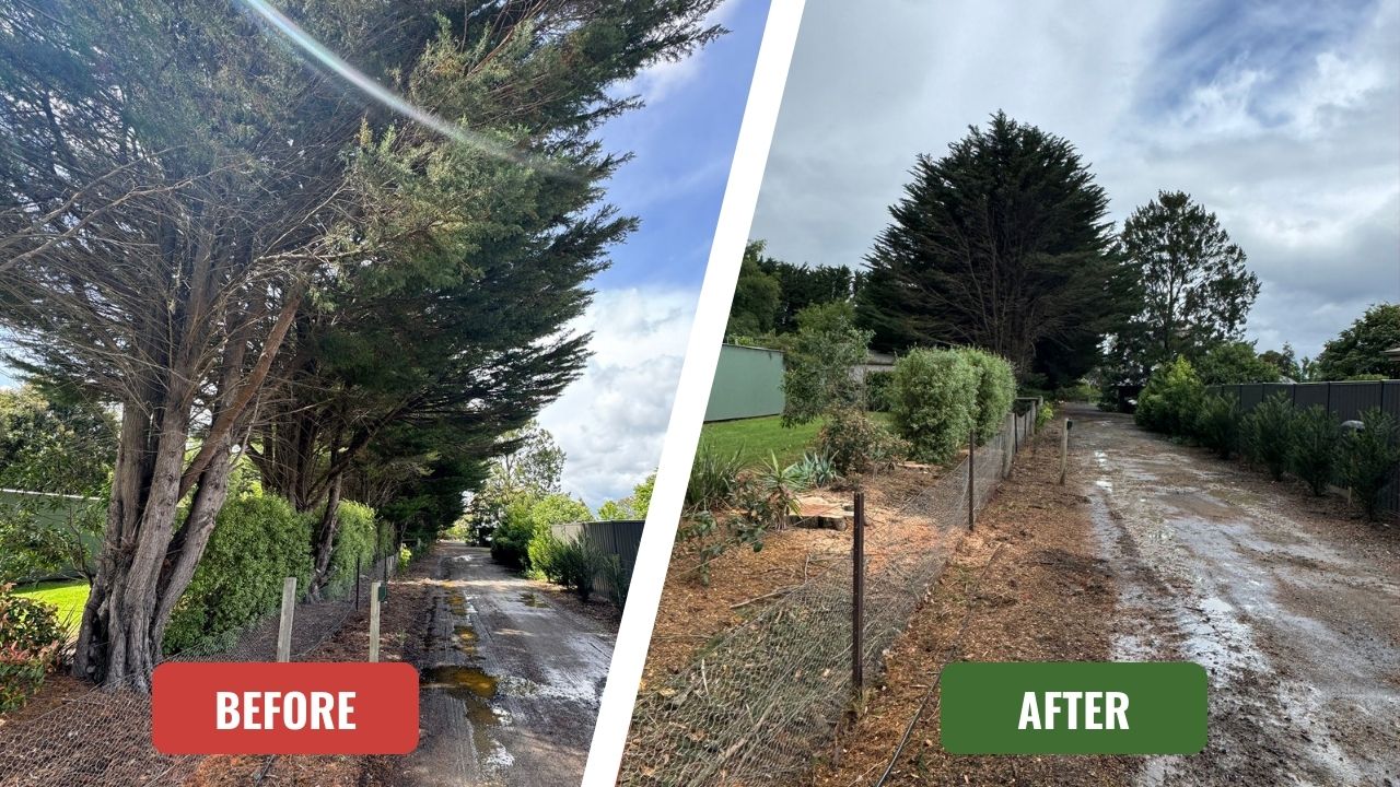 In many Gippsland properties, pine trees were planted decades ago and have now outgrown the space available. At this stage, pruning alone is often not enough and full removal becomes the safest option.